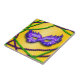 Máscara roxa cintilante com miçangas verdes e roxas em um fundo amarelo.