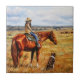 Uma jovem vaqueira espera que seu pai se recupere para que comecem a arredondá-lo. O seu verdadeiro cão de vaca senta-se ansiosamente a observar o rebanho à distância enquanto o cavalo aproveita esta oportunidade para deitar. Trabalho de arte realista criada de uma pintura original de óleo pelo artista equino e da fauna selvagem Crista S. Forest.