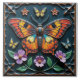 Uma borboleta colorida com asas laranja e amarela, cercada por flores e borboletas menores, colocada sobre um fundo azul escuro dentro de um quadro quadrado de ornamentado.