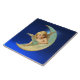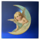 Bronzeado brilhante e loiro, anjo romântico de olhos azuis pendurado na Lua com uma brilhante pedra azul da safira em 3D