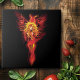 Uma mulher falsa com asas. Uma fênix em chamas vermelhas, amarelas e laranja num pano de fundo de preto.