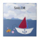 Um veleiro com uma vela vermelha e uma design de âncora ao lado veleja o azul-oceano. Um peixe sendo viciado. A palavra 'Sailor' pode ser alterada se desejado.