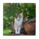 Um gato se senta no jardim verde, próximo a um tronco e olha à frente