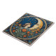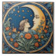 Um jovem de cerca de 20 anos com cabelo castanho encaracolado olhando para uma lua crescente com um rosto olhando para trás, cercado por flores e estrelas, fundo azul escuro.