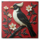 A square tile with a red background features a bird perched on a branch, surrounded by flowers and leaves. The bird has a black head and back, a white chest, and a distinctive white crest on its head. It has a yellow beak and a dark eye. The branch is dark brown, and the leaves are dark green. The flowers are white with yellow centers.