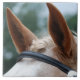 Um cavalo roan da morango está na atenção com as orelhas dianteiras enquanto espera para entrar no anel da mostra. Este pônei gelding está pronto para a equitação inglesa com seu forelock trançado e seu freio inglês. Seu número da competição do adestramento pode ser manchado no direito inferior da foto.
