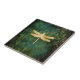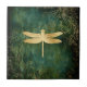 Este belo azulejo cerâmico apresenta uma libélula ouro sobre um fundo verde esmeralda verde vintage grunge.