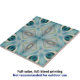 Esse azulejo cerâmico apresenta um padrão caleidoscópico complexo. O design é simétrico, com formas abstrato que lembram flores e figuras geométricas. O azulejo é enfeitado com uma paleta calafável de vários tons de azul, lacre, creme e branco, que se misturam harmoniosamente para criar um efeito visualmente agradável. A parte central do design é caracterizada por camadas sobrepostas que adicionam profundidade ao padrão geral. Os elementos em forma de diamante estão aninhados no meio, cercados por estruturas semelhantes a pétalas. O uso de tons mais escuros em determinados pontos fornece um contraste impressionante, aumentando o apelo visual do azulejo.