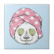 Uma panda bonita numa toalha com pepinos nos olhos.