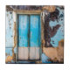 Enquanto caminhava pelas ruas nas pequenas aldeias das ilhas Cabo Verde, fiquei impressionado com a incrível mistura de cores, texturas e materiais que oferece belas oportunidades para fotografias urbanas. Nesta imagem: parede azul, bege e marrom e uma porta azul.