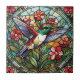 "beija-flor", "pássaro verde-zunido", "flores vermelhas florais", "arte estilada de vidro", "natureza floral de vidro manchado", "belos animais em voo", "asas bonito espalhadas por voadores",