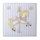 Um pônei de carrossel de circo bonito com mané e cauda fluidos. Flores cor-de-rosa e Lavanda azuis e sotaques cardíacos cor-de-rosa. Bonito fundo azul de faixa azul pastel.