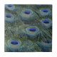 Fechar as penas de pavão em cores vibrantes no azulejo decorativo.