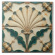 um design floral simétrico com um elemento semelhante a um ventilador central composto por pétalas alongadas, esbranquiçadas, esboçadas com linhas finas e marrons. Abaixo do ventilador, há folhas verdes estilizadas com veias mais escuras, dispostas simetricamente. Os cantos de cada azulejo são enfeitados com um motivo floral, ouro e grande. O fundo dos azulejos é um creme esbranquiçado, fornecendo um contraste suave aos elementos verdes e ouros. Uma borda verde com quadros de sombra ligeiramente mais escuros em cada azulejo, adicionando profundidade e definição ao design geral. Os azulejos têm aparência levemente envelhecida, com sutis imperfeições e variações de cor.