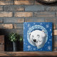 Um retrato de um urso polar desenhado no estilo art nouveau. Flocos de neve ao redor do urso polar contra tons de fundo azul.