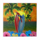 O por do sol tropical e colorido do oceano atrás das prancha, palmeiras, um papagaio do macaw empoleirou-se nos conselhos de surf, e o hibiscus floresce na parte inferior.