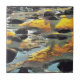 Um design de arte das rochas, impressões de pés, areia e piscinas rochosas na praia ao pôr do sol.