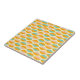 Repeating geometric pattern with overlapping leaf shapes in orange, teal, and pink on a beige background. The design conveys a retro, vibrant feel.