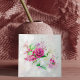 Belo design de azulejo de cerâmica com composição floral romântica com rosas cor-de-rosa, verde, boque e faíscas sobre fundo branco de madeira.