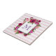 Azulejo de cerâmica monograma com buquê floral composto por rosas de rosa claro e papoilas cor-de-rosa escuro com muitas folhas verdes e peludas. Um quadro em camadas para colocar sua dentro de letra monográfica personalizada. O fundo é um padrão de listras rosa-macio.
