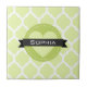 O padrão de latência marroquina em uma cor verde-clara, com uma etiqueta verde e cinza, com coração para você personalizar facilmente seu nome. Um design de padrão de 'quatrefoil' de tendências que faria um presente personalizado legal para seus presentes de aniversário, Dia de os namorados, Natal ou graduação.