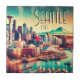 Esta imagem artística de Seattle mostra a icônica Agulha Espacial elevada contra o horizonte moderno da cidade. A cena captura a Baía de Elliott com barcos em primeiro plano e o majestoso Monte Rainier em segundo plano. As cores vibrantes e o dia ensolarado evocam a energia dinâmica e a beleza natural desta cidade noroeste do Pacífico. O estilo combina o realismo com tons quentes, convidando-os a criar uma visão pitoresca.