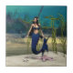 Renderização digital em 3D de uma sereia fofa sobre fundo oceânico de fantasia azul