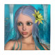 Sereia bonita com cabelo azul e verde e flor de lírio de água amarela em um fundo oceânico de fantasia azul