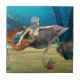 Dois amigos, uma bela sereia nadando com um golfinho num oceano de fantasia azul