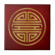 Este azulejo cerâmico apresenta um símbolo chinês, que representa a longevidade. O símbolo tem cor de ouro sobre fundo vermelho texturizado.