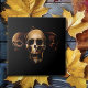 Três crânios humanos contra o fundo do preto, uma pequena criatura está espiando o crânio do meio