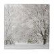 A design apresenta uma fotografia de árvores cobertas de neve na floresta.