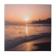 Foto impressionante de um pôr do sol sobre uma praia deserta com montanhas e palmeiras à distância.