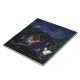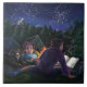 A arte Starry Night de Traci Van Wagoner impressão, posters, acessórios e presentes mostra nossa pintura original de duas crianças e seu grande e negro cão acampando sob as estrelas lendo um livro fantástico ao redor de um fogo no acampamento sobre cavaleiros e dragões. A magia da história está subindo no céu estrelado para mostrar um cavaleiro e um dragão numa dança eterna noturna de estrelas. Aproveite um acampamento noturno de verão nas montanhas.