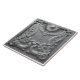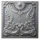 An ornate architectural panel in a monochromatic gray color scheme. The panel features a central sunburst design at the top, with a spherical center and radiating spikes. Symmetrical, stylized floral and foliate patterns extend from the center towards the bottom corners, with curved, ribbon-like elements framing the sides.