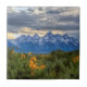 Esta foto caracteriza um por do sol do verão em Wyoming com o Tetons grande no fundo.