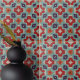 Esse azulejo cerâmico apresenta um padrão geométrico de abstrato, que exalta um senso de equilíbrio e precisão. O design lembra o imaginário caleidoscópico, com formas simétricas que irradiam do centro em uma explosão harmoniosa de vermelho, azul, lacre e bege O fundo tem uma textura angustiada, dando ao azulejo um charme antigo, mantendo uma estética moderna. A paleta de cores ousada mas harmoniosa garante que o azulejo adicione interesse visual sem sobrecarregar o espaço. É uma peça versátil que pode servir como arte decorativa de parede ou ser usada funcionalmente para ladrilhar pisos ou paredes, fazer adequado para uma variedade de projetos de design de interiores.