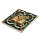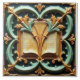 A ceramic tile featuring an open book codex at the center, surrounded by ornate, symmetrical vines in a palette of gold, turquoise, and dark green. The book is depicted with a raised, three-dimensional effect, its pages slightly yellowed, suggesting age or a vintage aesthetic. Flanking the book are stylized floral or foliate elements in gold and turquoise, adding to the symmetrical composition.