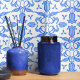Linda tulipa e padrão de superfície estelar repetem o azulejo design em azul e branco. Arte gráfica exclusiva e design por Sarah Trett para www.mylittleeden.com