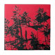 Um design de abstrato de arte de flores silvestres pretas silenciado contra um céu vermelho.
