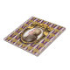 A ilustração original de ZoeSPEAK sobre este pequeno Azulejo cerâmico apresenta um retrato do compositor de música clássica Wolfgang Amadeus Mozart. O retrato é um perfil definido em um quadro de ouro oval de ornamentado. A armação pende sobre um fundo de papel de parede roxo com cachos de uvas em filas e listras brancas e lavandas verticais.