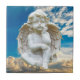 Anjo de mármore bonito do bebê com as asas bonitas grandes, cabelo encaracolado e os olhos grandes sentando-se na nuvem com o céu azul no fundo