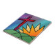 Um design de vidro manchado ilustrando a manhã da Páscoa, com uma cruz vermelha sobre colinas verdes ao lado de um nascer de sol feroz.
