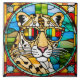 Os óculos de sol que vestem o leopardo são retratados em vidro manchado.
