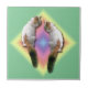 O gato Calico é espelhado em frente a uma forma de diamante colorida num arco-íris de cores pastéis (verde, rosa, roxo, azul, amarelo).
