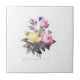 O buquê bonito de Fleurs do Belle de Redoute de rosas cor-de-rosa e amarelos cobriu com borboletas azuis, em um azulejo branco.