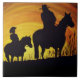 Uma pintura de um menino e de cavalos de equitação do vaqueiro no por do sol.