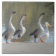 Gansos e pelicanos rolando na borda do lago. Gansos castanhos com estômago branco e pescoço têm um grande botão basal na parte superior da conta. Todos os três estão se esforçando ao longo da borda dos lagos com cabeças erguidas. Ao fundo está um pelicano branco e as águas calmas do lago.