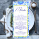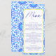 Eleve a decoração da mesa do chá de bebê com este Cardápio Minimalista de Azulejo Italiano Azul! Com um delicado motivo de azulejo mediterrâneo e cabeçalhos elegantes em letra cursiva, este modelo de cardápio personalizável permite que você mostre os detalhes do seu menu com estilo. Perfeito para chás de bebê com tema italiano ou neutros, o design limpo combina charme europeu atemporal com simplicidade moderna. Ideal para mesas de sobremesas, bufês.