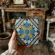Inspirada nos azulejos tradicionais Azulejo de Espanhas e Portugal, essa porta copos de azulejo cerâmica apresenta um intrincado padrão geométrico em azul-marinho e amarelo-ouro ensolarado.